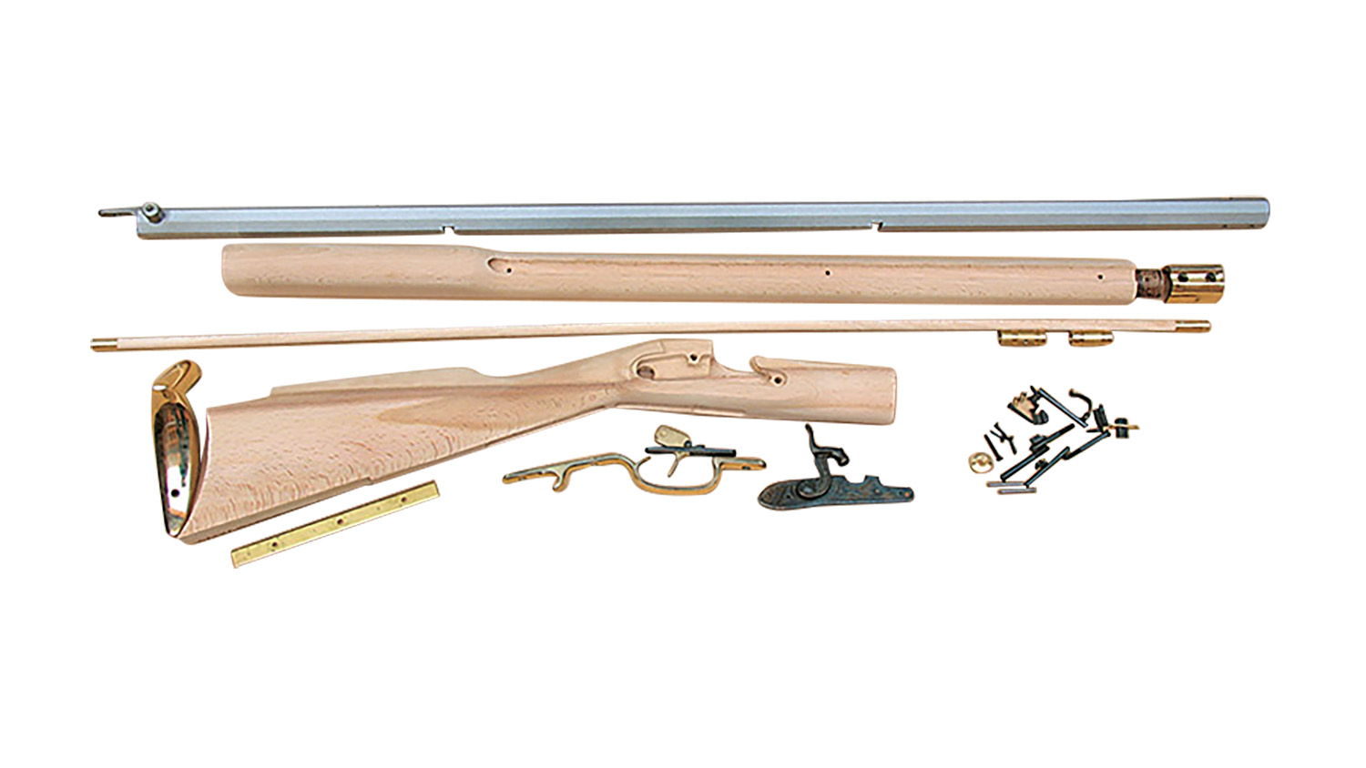 The Kentucky Rifle kit features a 33.50″ percussion, octagon barrel with a fixed tang; brass trigger and fixed/blade sights.